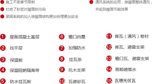 借鑒歐洲坡屋面防水理念,將平面防水改為立體防水,采用新型防水板材料,將材料防水和構(gòu)造防水于一身,配合屋面系統(tǒng)組件,實(shí)現(xiàn)全天候全干作業(yè)。節(jié)省了屋面各類保護(hù)層次,打破了屋面冬季及雨后陰濕無法施工的常規(guī),縮短了工期,提升系統(tǒng)安全性能。